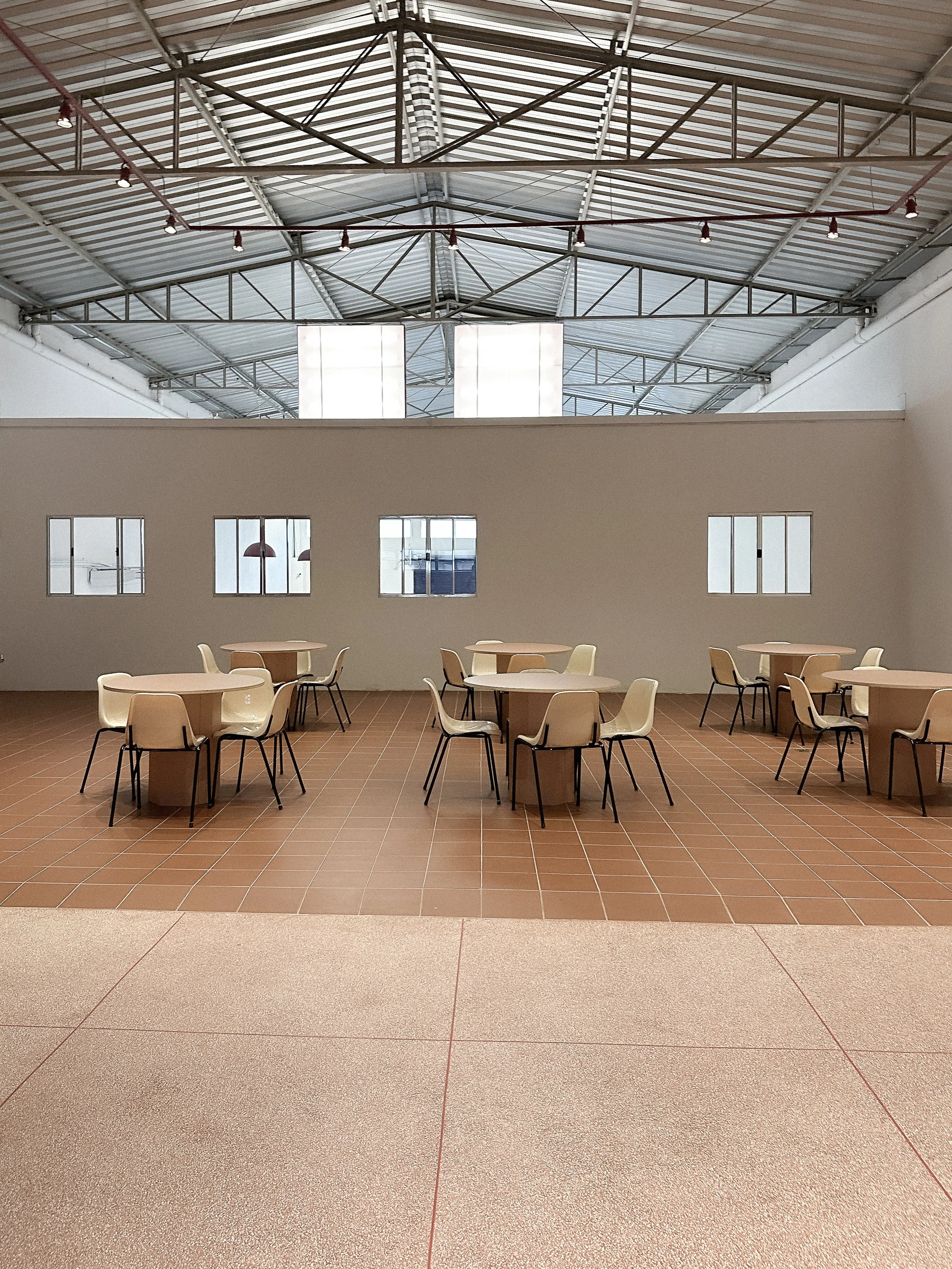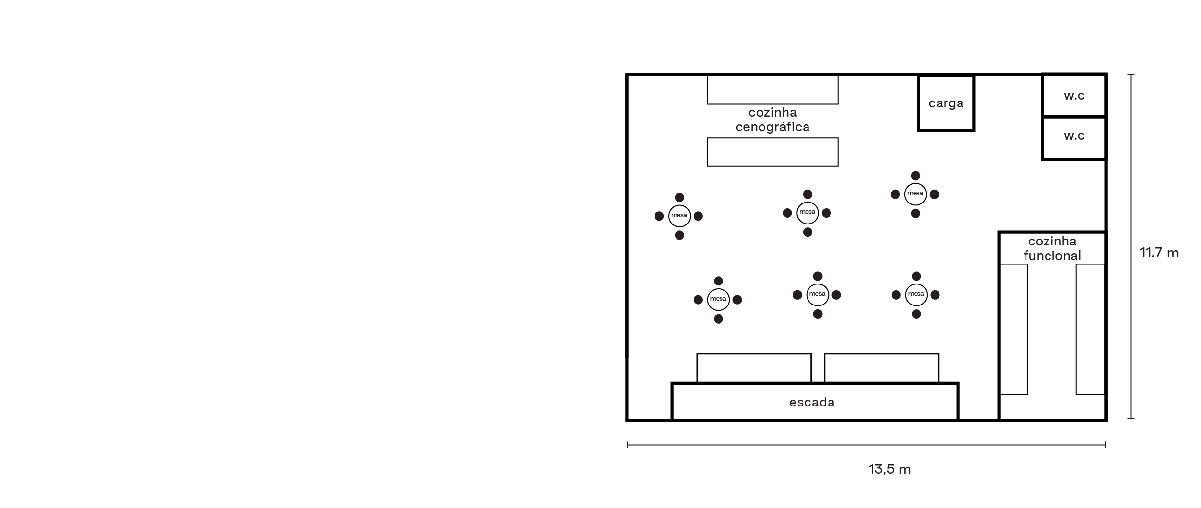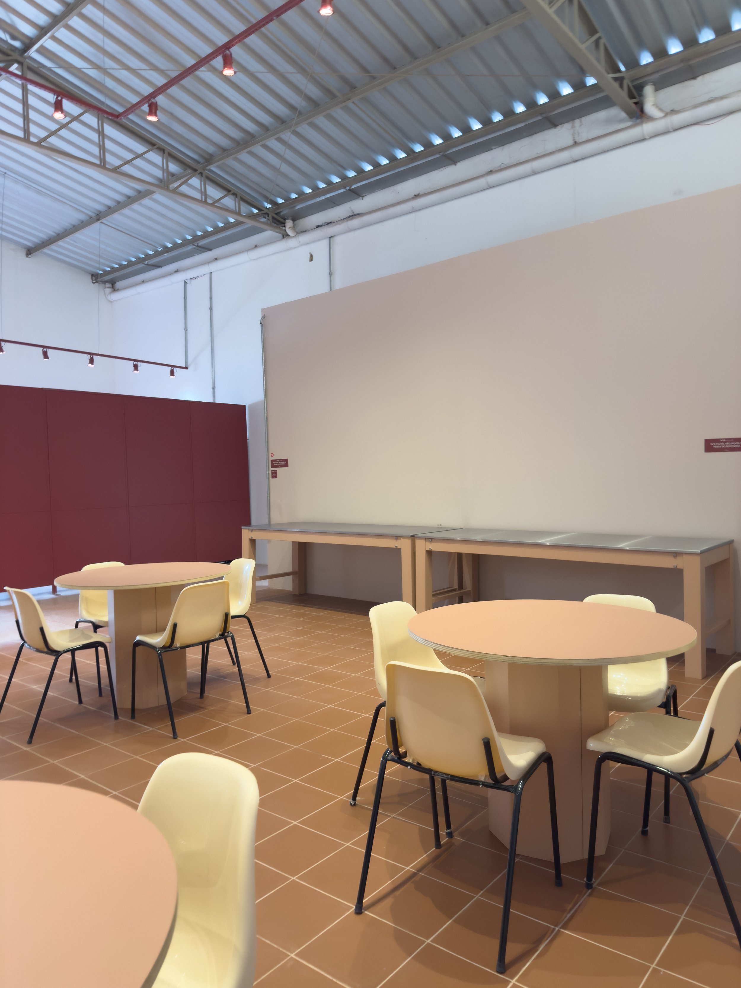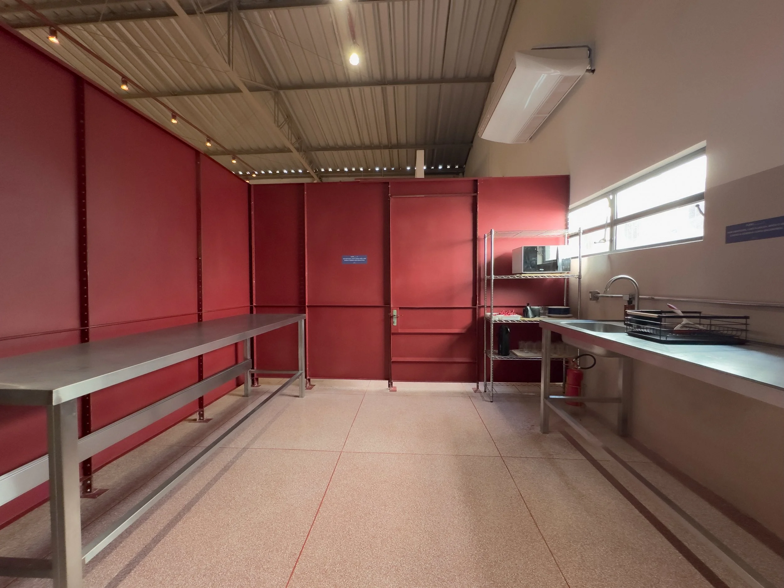 No primeiro andar, o estúdio conta com cozinha e área de refeições dedicadas à alimentação da equipe, em um espaço com mais de 130 m². A estrutura inclui ainda duas bancadas para catering, com 2,20 m de comprimento cada, além de diversas mesas que acomodam até 40 pessoas sentadas, com possibilidade de ampliação conforme a necessidade da produção.